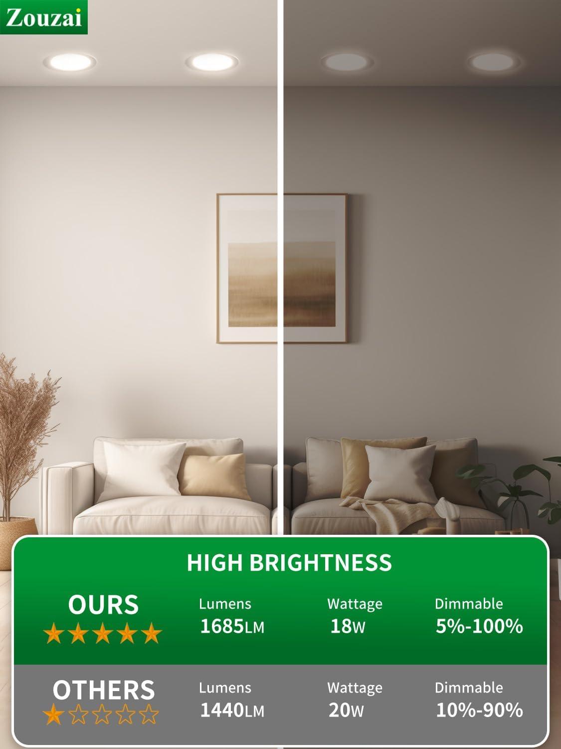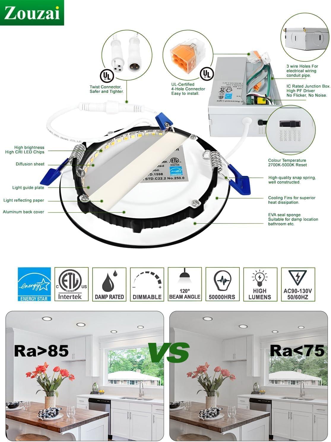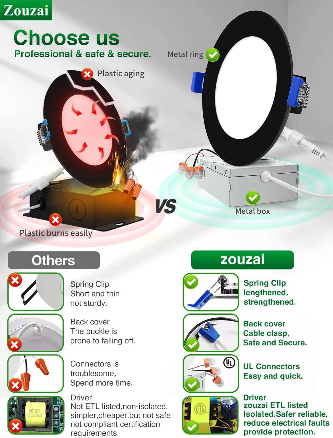 👍【Highest Industry Standards】The whole zouzai's recessed lighting is certified by ETL of a high standard. Different from the wire nut of other brands. Our high-quality wire terminal has passed UL certification. warrant y 5 years.